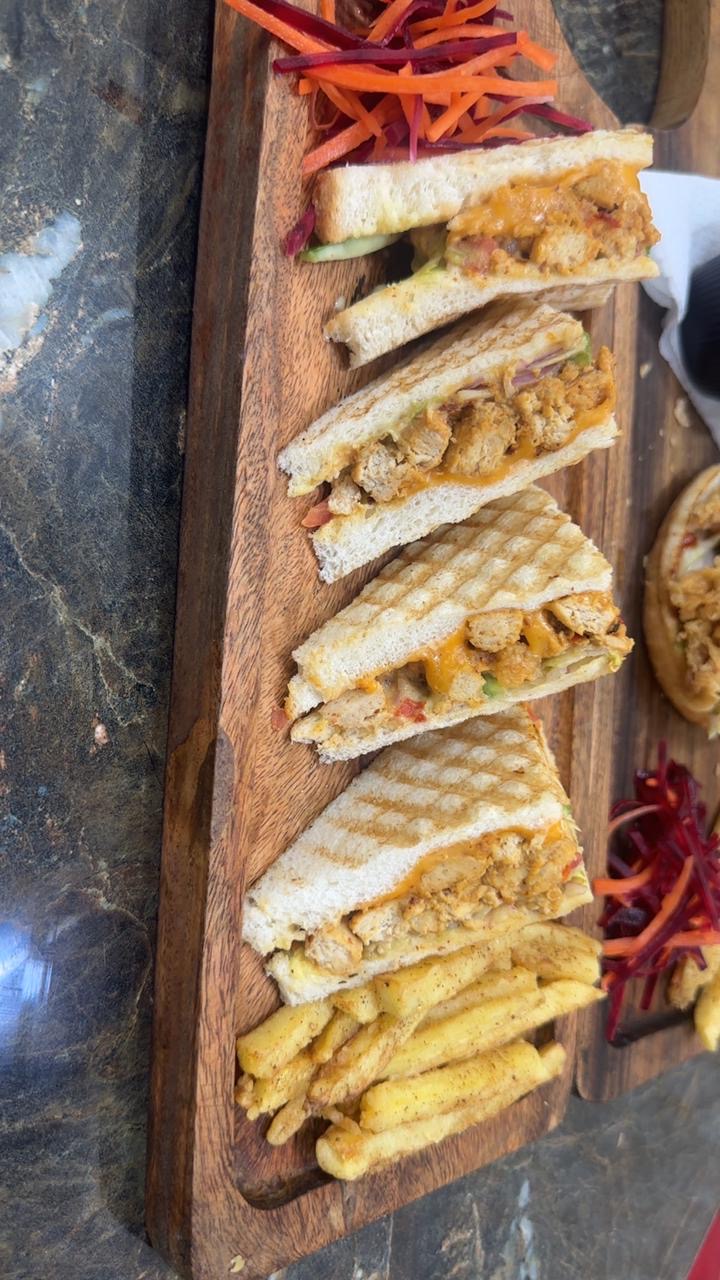 Triple-layer stuffed sandwich with egg, chicken & fresh veggies.