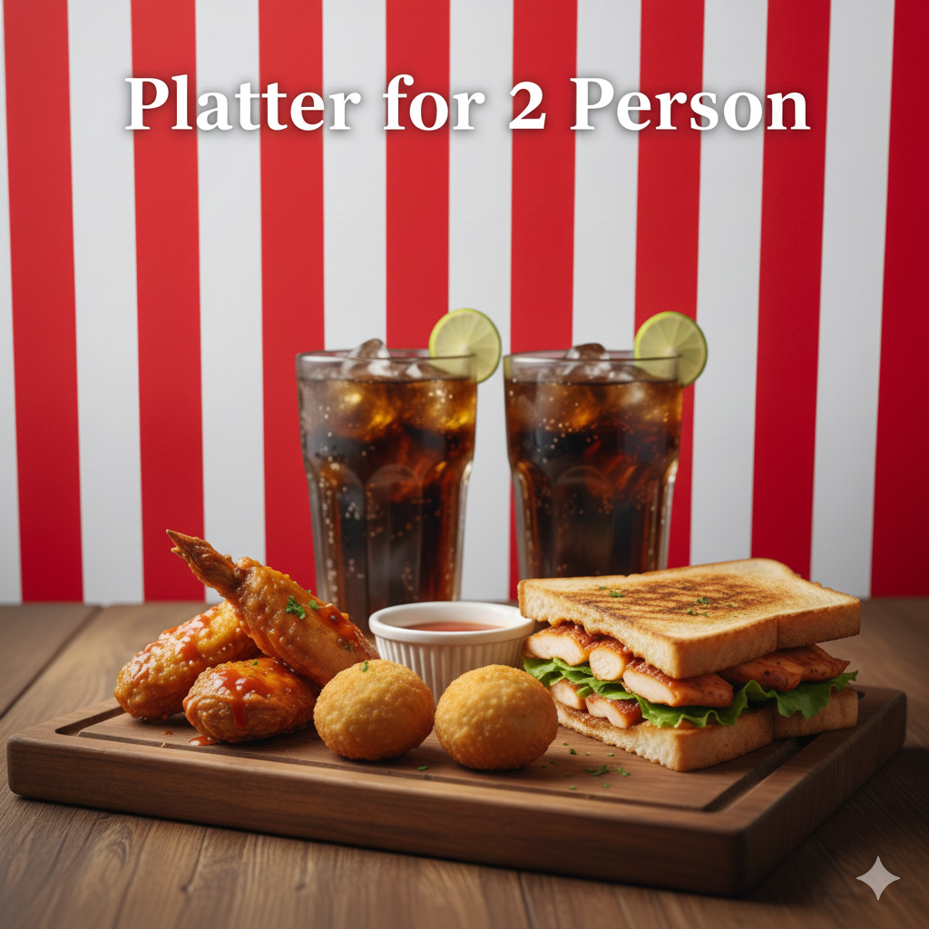 2 hot wings, 2 nuggets, 2 crispy chicken balls, 1 grilled chicken tikka or BBQ sandwich, and 2 soft drinks